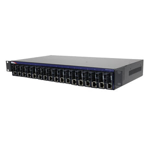 The IMC-318I centralize-powered chassis is designed with a modular enclosure that takes up to 18 miniature media converters (the IMC-350/370 series). It provides high port density mounting and elevates much power efficiency. By easily and effectively connecting multiple converters in one chassis, the IMC-318I eliminates the mass needs of AC power adapters and thus saves much network device construction space.x